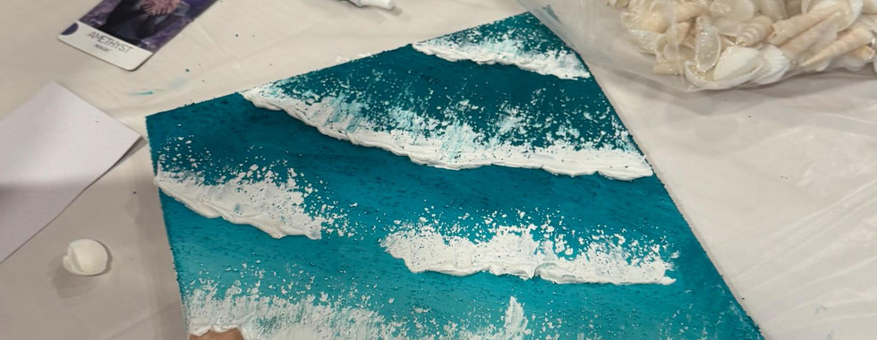 This hands-on experience teaches you how to sculpt waves, shoreline foam, and sandy textures using modeling paste, palette knives, and layered coastal colors. The result is a tactile, dimensional ocean artwork that captures movement, depth, and the calming energy of the sea.